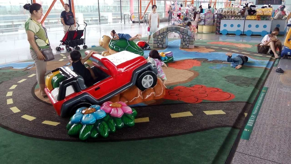 C09登機口兒童活動區(qū)是以汽車為主題的活動區(qū)域,區(qū)域內卡通汽車、海龜分布錯落有致,地毯上繪有卡通跑道圖案,整體風格活潑、主題性突出。