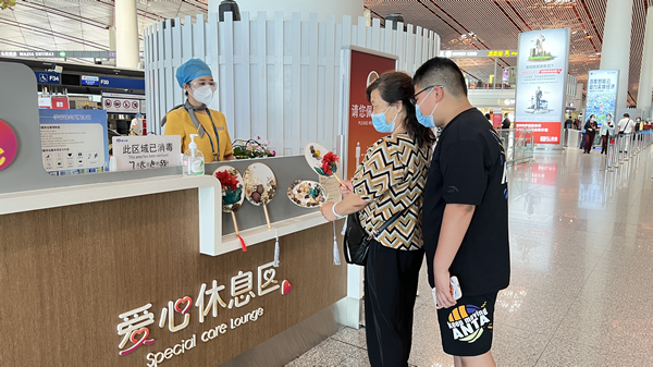 暑運(yùn)期間,隨著老年旅客和兒童旅客的增加,首都機(jī)場(chǎng)航站樓暖陽團(tuán)隊(duì)在每個(gè)柜臺(tái)配備了飲用水、藿香正氣水、風(fēng)油精、十滴水等清涼解暑物品,供有需要的旅客使用。同時(shí),團(tuán)隊(duì)成員充分發(fā)揮自己的想象力和主動(dòng)性,DIY 出獨(dú)具特色的團(tuán)扇,贈(zèng)送給前來愛心休息區(qū)休息的老年旅客,得到了旅客們的一致好評(píng):“扇子非常精美,也很有意義。在疫情這個(gè)特殊時(shí)期也能感受到來自首都機(jī)場(chǎng)的濃濃的關(guān)愛,在這炎炎夏季讓我們感受到了絲絲清涼”。