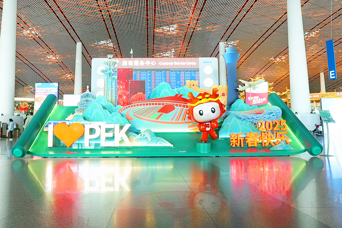 春運(yùn)期間,首都機(jī)場上新樓內(nèi)景觀,為往來旅客呈現(xiàn)了一場別開生面的視覺盛宴。在3號(hào)航站樓內(nèi),一幅絢麗的新春畫卷徐徐展開。以綠色卷軸打底,景觀巧妙地融入北京標(biāo)志性建筑,俏皮可愛的首都機(jī)場服務(wù)品牌IP“都都”和“新春快樂”4個(gè)大字仿佛在向每一位旅客熱情地打招呼,傳遞最真摯的新春祝福,讓旅客感受到新春的喜悅。