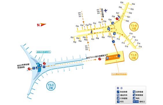 T3-D國內(nèi)到達(dá)旅客可采用擺渡車/APM通行。