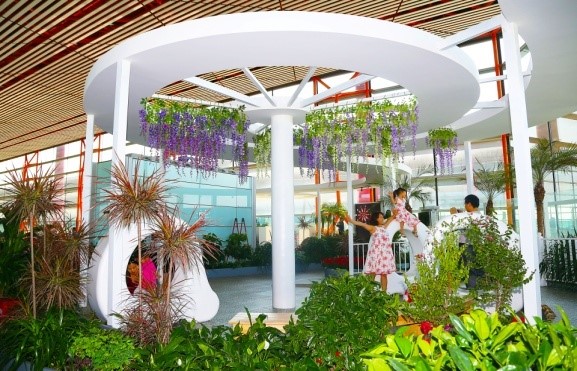 C18登機口處有一處景觀叫夢想種植園,整個景觀以中國祥云的傳統(tǒng)曲線形式為設(shè)計出發(fā)點,設(shè)計帶有中國風(fēng)情的現(xiàn)代流線型的室內(nèi)植物花園,擁有木芙蓉、凌霄、紫薇、非洲菊、錦葵、大麗花等多種新型綠植。三大平臺的高差變化,多樣親民的功能分區(qū),綠色植物的高低圍合,營造出有傳統(tǒng)特色的自然、夢幻的室內(nèi)景觀。