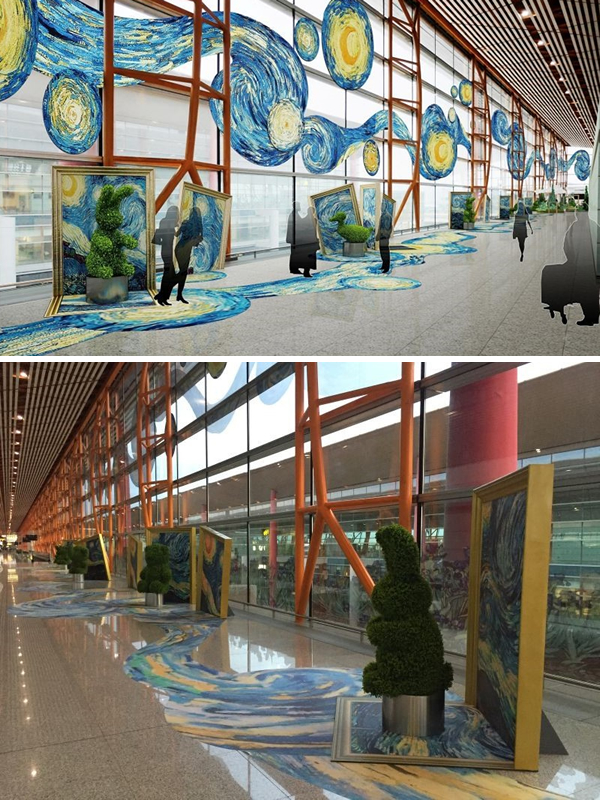 星空長廊以星空為主題,玻璃幕墻上有高為5.2米的星月夜圖案,沿途地面鋪設(shè)星月夜地貼,設(shè)置了六處動物造型綠植,有兔子、小熊、大象、麋鹿等動物造型,共計(jì)70米長。
