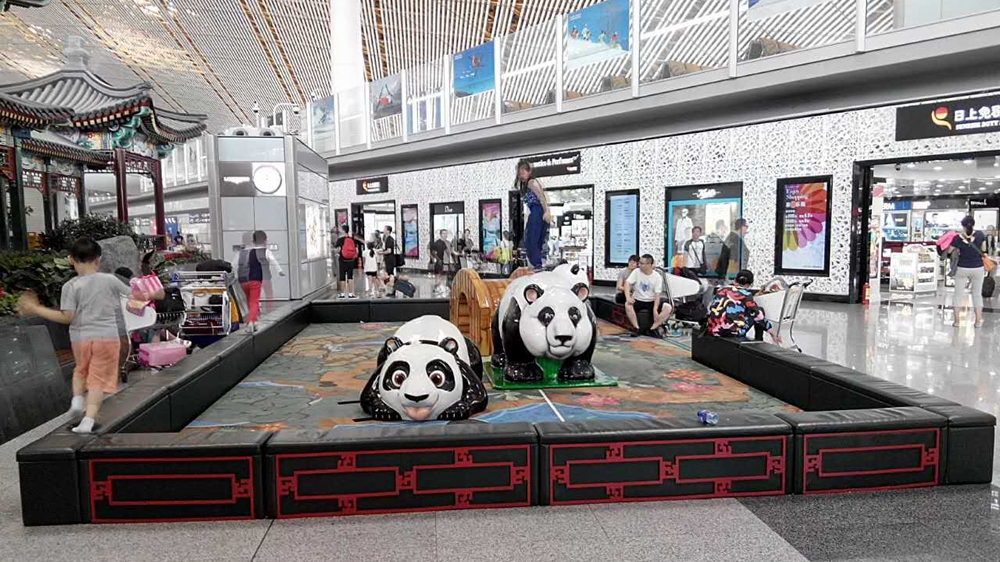 E21登機口的兒童活動區(qū)以中國國寶熊貓為主題建造。樂園內憨態(tài)可掬的大熊貓或臥或躺形態(tài)各異,綠色圍墻紅色欄桿與旁邊的中式古建筑相應成趣。