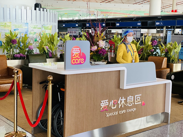 該愛心休息區(qū)位于出發(fā)層核心區(qū)域,配有醒目的標志、專業(yè)的團隊和舒適的空間,可為預約首都機場特殊旅客服務的老年人、殘疾人、孕婦、兩院院士等特殊人群提供舒適的休息環(huán)境。同時,愛心休息區(qū)值守問詢員還可隨時為休息旅客提供問訊、航班出發(fā)提醒、輪椅借用、免費電瓶車及愛心陪伴服務。